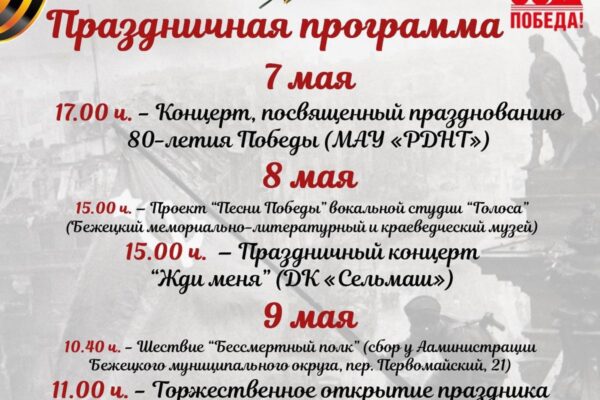 Бежецк, 26 апреля — МОЛОГА.ИНФО Администрация Бежецкого муниципального округа опубликовала программу празднования юбилейного, 80-го Дня Победы. 7 мая 17.00, МАУ «РДНТ» концерт, посвященный празднованию 80-летия Победы 8 мая 15.00, Бежецкий мемориально-литературный и краеведческий музей проект «Песни Победы» вокальной студии «Голоса» 15.00, ДК «Сельмаш» праздничный концерт «Жди меня» 9 мая 10.40 — шествие «Бессмертный полк» (сбор…