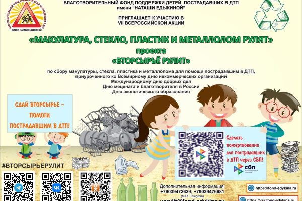 Тверская область, 2 марта — МОЛОГА.ИНФО Благотворительный фонд поддержки детей, пострадавших в ДТП, имени «Наташи Едыкиной» приглашает жителей Тверской области к участию в VII всероссийской акции «Макулатура, стекло, пластик и металлолом рулят», которая проводится в рамках проекта «Вторсырье рулит». Проект направлен на привлечение внимания граждан к ресурсосбережению и экологической культуре, развитие природной переработки и помощь…