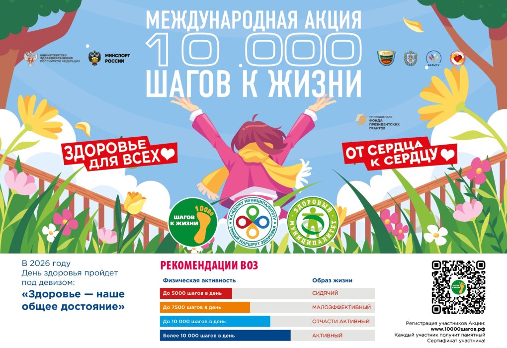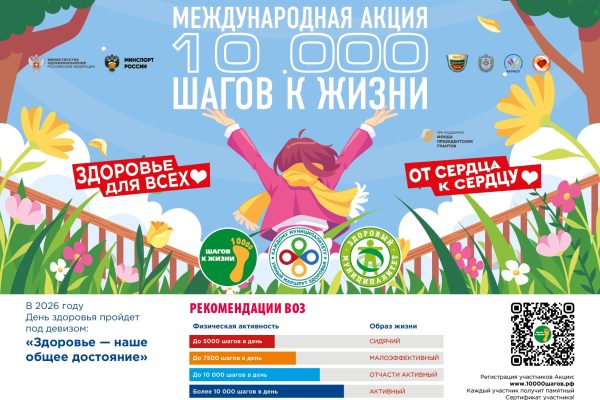 Бежецк, 19 марта — МОЛОГА.ИНФО С 5 по 12 апреля 2026 года традиционно состоится Международная акция «10 000 шагов к жизни», приуроченная ко Всемирному дню здоровья, который отмечается 7 апреля. Ежегодно в акции участвуют более миллиона человек. Присоединяйтесь и вы! Зарегистрируйтесь на акцию уже сейчас ligazn.ru/10000. Сделайте шаг к здоровью вместе со всеми. Все участники…