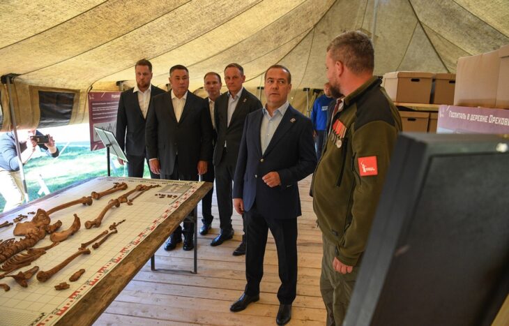 Дмитрий Медведев и Игорь Руденя ознакомились с экспонатами полевого музея, где представлены артефакты, найденные в ходе поисковых работ в Ржевском округе: солдатское обмундирование, оружие, личные вещи бойцов, элементы военной техники и предметы быта времен Великой Отечественной войны. Кроме того, состоялся осмотр хранилища останков поднятых бойцов.