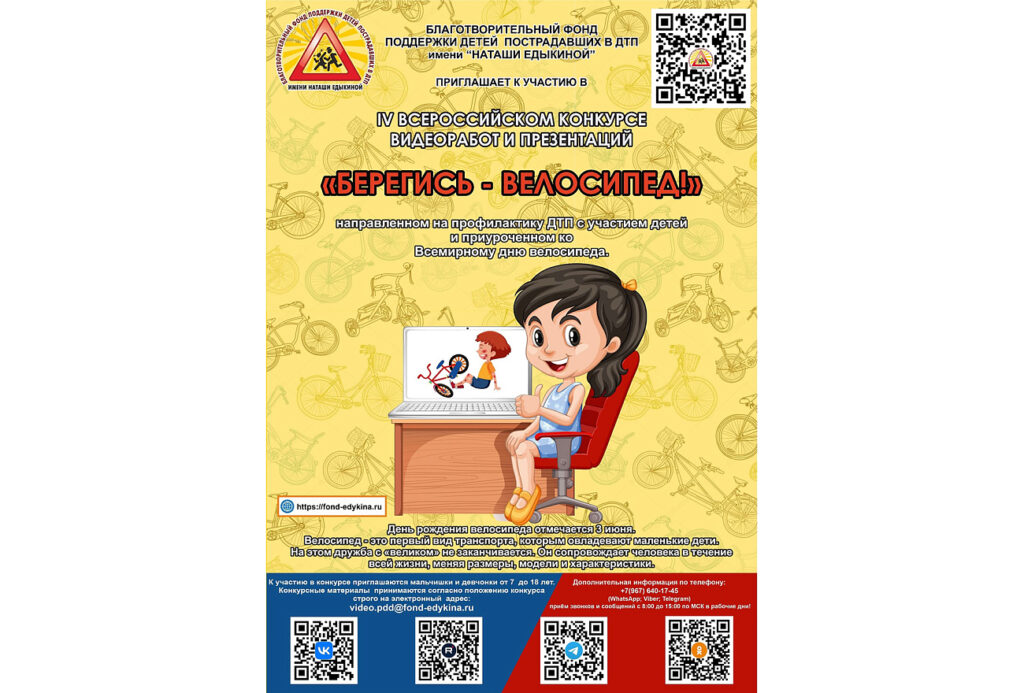 Юные жители Верхневолжья вместе с родителями могут поучаствовать в конкурсах, посвящённых безопасной езде на велосипедах. Творческие состязания, приуроченные ко Всемирному дню велосипеда, проводит Благотворительный фонд поддержки детей, пострадавших в ДТП, имени «Наташи Едыкиной».