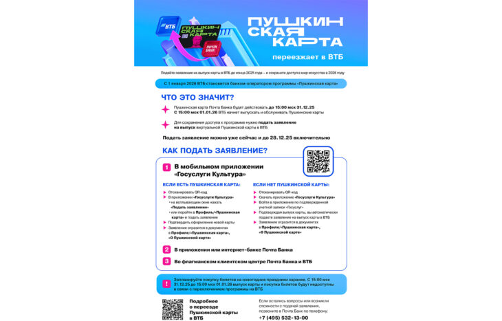Молодым людям Тверской области напоминают о необходимости перевыпуска «Пушкинской карты». Это связано со сменой оператора программы с АО «Почта Банк» на Банк ВТБ (ПАО) с 1 января 2026 года. Для удобства пользователей «Пушкинские карты» перевыпускаются заблаговременно, поэтому сделать это можно прямо сейчас.