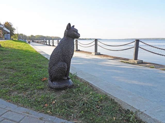 У этой скульптуры глубокий смысл. По легенде, когда город затопили в связи с постройкой водохранилища, когда вода заполнила некогда оживленные улицы, кошки собирались на берегу и не понимали, как им вернуться в свои привычные дома, которых не стало. Сидели вот так и смотрели на Волгу.