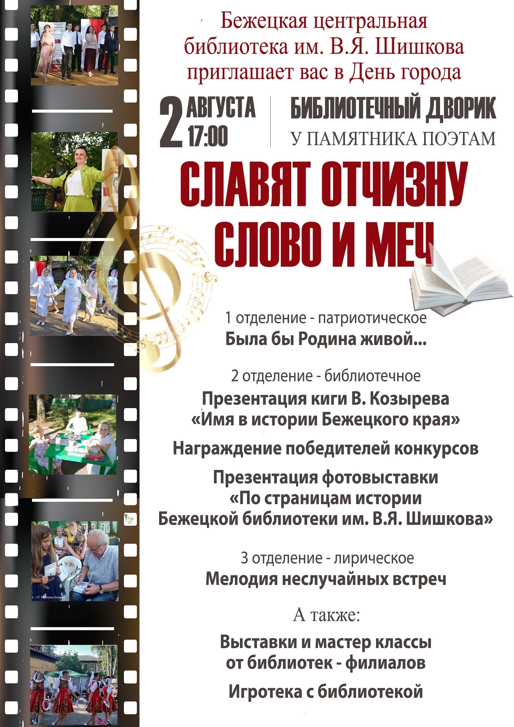 17.00 – праздничная программа от библиотеки им. В.Я. Шишкова «Славят Отчизну слово и меч» (библиотечный дворик на ул. Большой за памятником семье поэтов Гумилевых-Ахматовой)