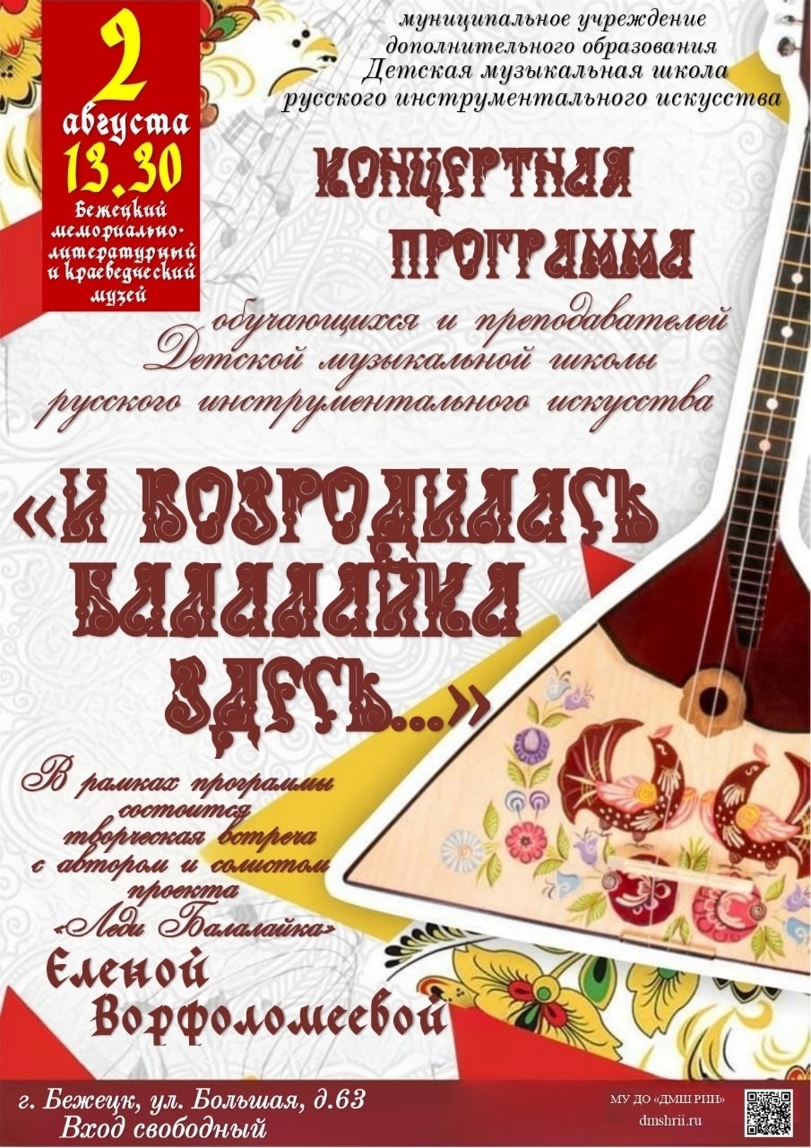 13.30 – концертная программа «И возродилась балалайка здесь…» (в программе – выступление преподавателей и учащихся детских музыкальных школ Бежецка)