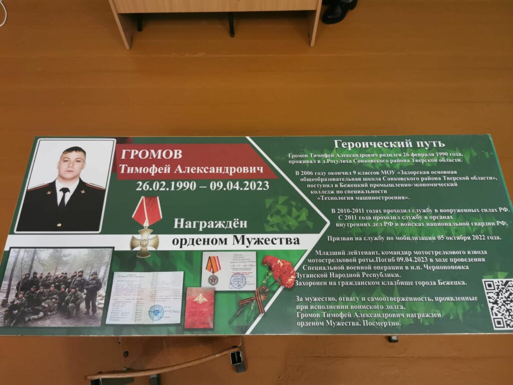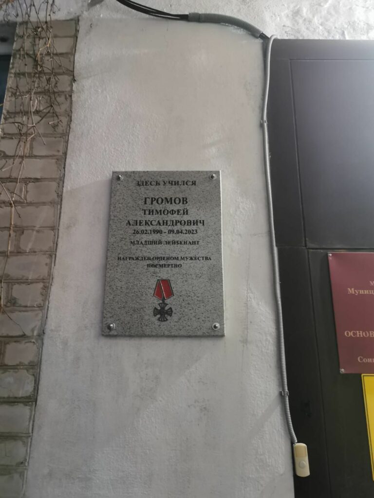 На дверях МОУ «Задорской основной общеобразовательной школы Сонковского района Тверской области» установлена Мемориальная табличка памяти о погибшем Громове Тимофее Александровиче.