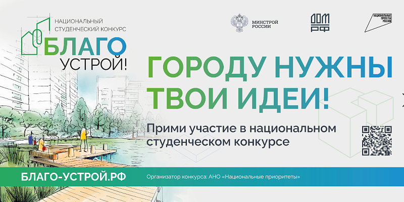 Национальный студенческий конкурс «Благоустрой!» проводится при поддержке Минстроя России и направлен на привлечение будущих архитекторов к участию в разработке проектов по формированию комфортной городской среды и созданию библиотеки креативных решений по благоустройству опорных населенных пунктов с целью дальнейшей реализации по программе национального проекта «Инфраструктура для жизни».