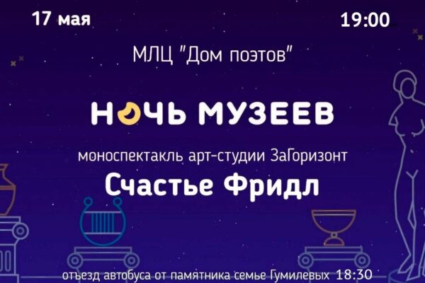 Бежецк, 12 мая — МОЛОГА.ИНФО Международная акция «Ночь музеев» ежегодно проходит в рамках празднования Международного дня музеев. В России в Год защитника Отечества мероприятие посвящено теме «Герои» и состоится 17 мая. В этот день в с. Градницы Бежецкого муниципального округа на базе МЛЦ «Дом поэтов» состоится показ моноспектакля арт-студии «ЗаГоризонт» «Счастье Фридл». Начало мероприятия — 19.00. Отъезд…