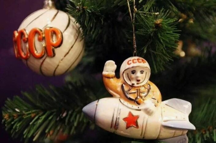 советские ёлочные игрушки (стеклянные шары, сосульки, фигурки зверей, космонавты, чайники);