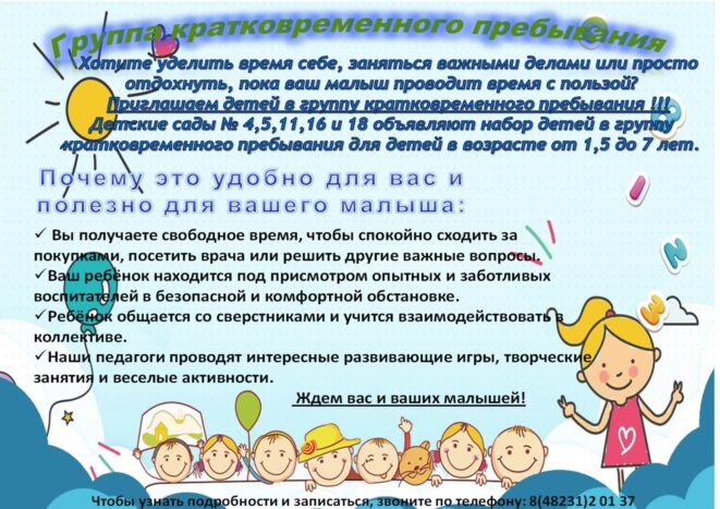 С 20 октября 2025 года на базе дошкольных образовательных учреждений: «Детский сад №4», «Детский сад №5», «Детский сад №11», «Детский сад №16», «Детский сад №18» открыты группы кратковременного пребывания детей.