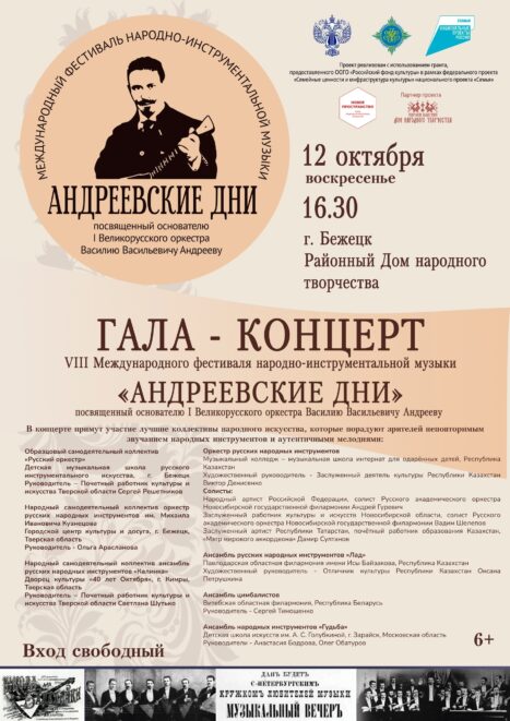 12 октября в 16.30 в Бежецке, в Районном Доме народного творчества состоится Гала-концерт VIII Международного фестиваля народно-инструментальной музыки “Андреевские дни”, посвященного основателю первого Великорусского оркестра Василию Васильевичу Андрееву.