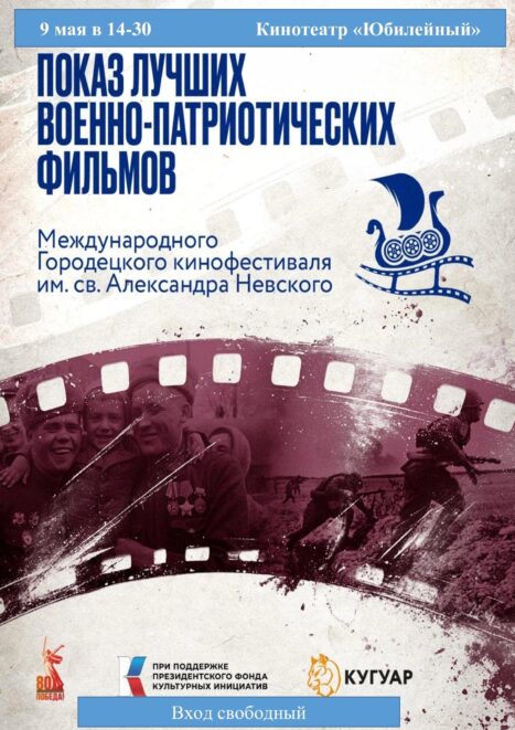 9 мая в 14.30 в кинотеатре «Юбилейный» состоится лучших военно-патриотических короткометражных художественных фильмов Международного Городецкого кинофестиваля им. св. Александра Невского.