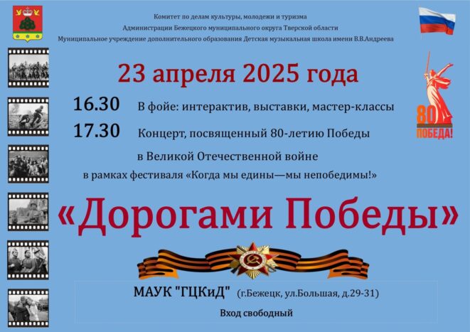 23 апреля в МАУК “ГЦКиД” в рамках фестиваля “Когда мы едины – мы непобедимы!” пройдет концерт “Дорогами Победы”, посвященный 80-летию Победы в Великой Отечественной войне.