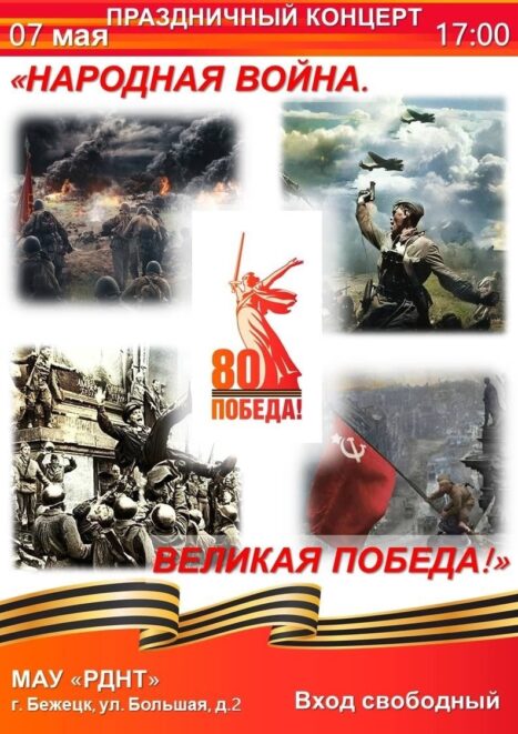 В Муниципальном автономном учреждении Бежецкого района Тверской области «Районный Дом народного творчества» 07 мая в 17-00 состоится большой праздничный концерт «Народная война. Великая Победа!».