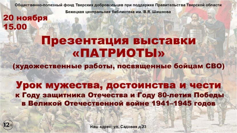 Бежецкая центральная библиотека им. В.Я. Шишкова приглашает бежечан на Урок мужества, достоинства и чести, посвящённый Году защитника Отечества и 80-летию Победы в Великой Отечественной войне 1941-1945 годов.