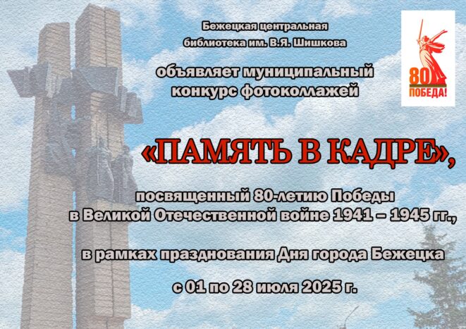 Бежецкая центральная библиотека им. В.Я. Шишкова в преддверии Дня города объявила старт муниципального конкурса фотоколлажей “Память в кадре”, посвященного 80-летию Победы в Великой Отечественной войне 1941-1945 гг.