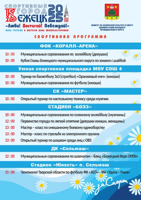 Комитет по физической культуре и спорту администрации Бежецкого муниципального округа приглашает 2 августа гостей и жителей Бежецкого муниципального округа на спортивные соревнования, посвященные Дню городу и Дню физкультурника.
