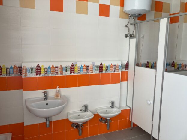 Съемочная группа БНТВ посетила обновленные санитарные комнаты, выполненные в плитке Kerama Marazzi. Цвета яркие, сочные. Установлено новое санитарное оборудование для удобства детей и взрослых.