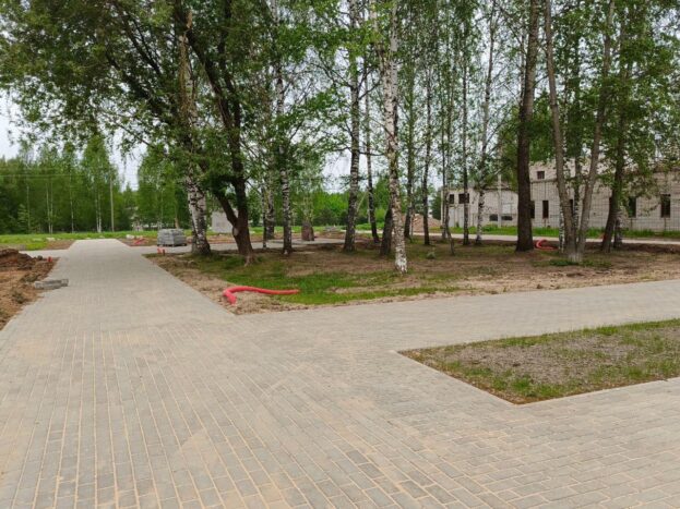 На данный момент пешеходные дорожки выполнены в брусчатке, появятся лавочки, новое освещение и детский игровой комплекс.
