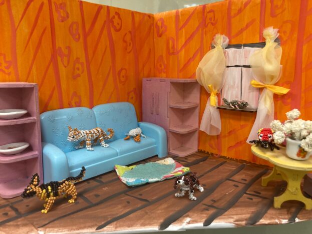 Варвара Филаретова: “Три года назад моя одноклассница принесла в школу маленького крокодильчика, выполненного из бисера. Поделка настолько мне понравилась, что я решила попробовать сделать такую же работу. Нашла в библиотеке необходимую литературу, изучила мастер-классы по бисероплетению, и в моих руках начали “рождаться” зверушки – тигры, собаки, кошки, насекомые и пресмыкающиеся. Поделки маленько размера, поэтому я оформляю их в одну большую, можно назвать, коллективную работу”.