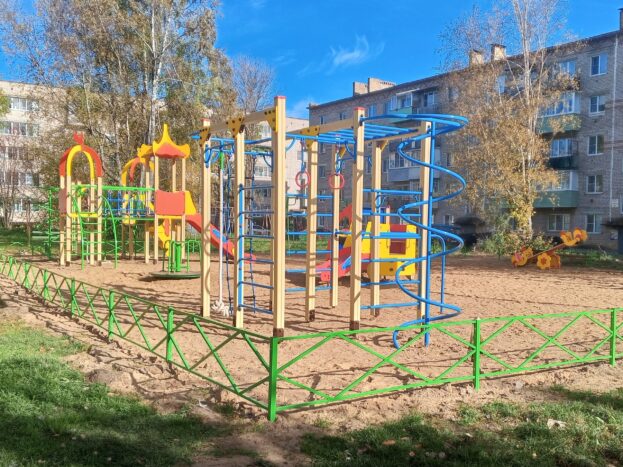 Во дворе многоквартирных домов на пересечении улиц Железнодорожная, Ленина и М. Калинина г. Кашина завершились работы по установке современной детской игровой площадки.