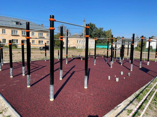 На площадке установлено разнообразное спортивное оборудование – турники, брусья, шведские стенки, элементы для бега и прыжков, а также обязательные вспомогательные элементы: безопасное покрытие, информационный стенд с правилами и нормативами. Площадка соответствует всем требованиям безопасности и имеет сертификацию.