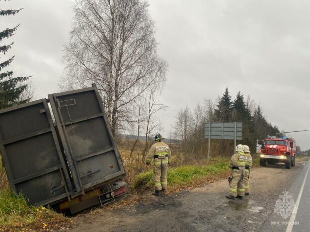 Водитель грузового автомобиля не справился с управлением, в результате чего произошел съезд с дорожного полотна.
