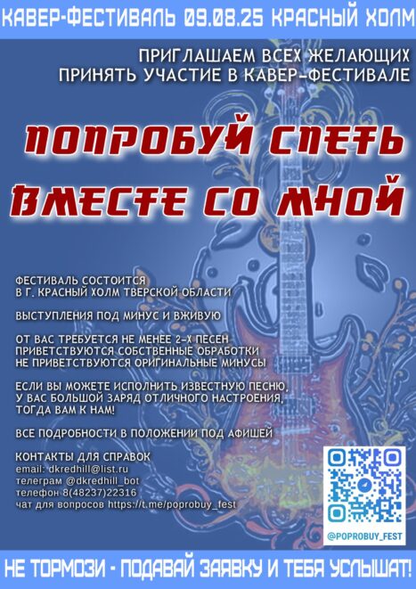 Муниципальное бюджетное учреждение культуры «Краснохолмский Дом народного творчества» объявило о приеме заявок на IV межмунипальный кавер-фестиваль «Попробуй спеть вместе со мной!».