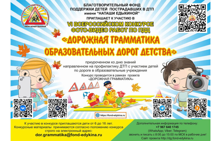 Кроме того, ребята могут поучаствовать в конкурсах, посвященных теме безопасности на дорогах. Их проводит Благотворительный фонд поддержки детей, пострадавших в ДТП, имени Наташи Едыкиной. Это конкурс рисунков «Со светофоровой наукой по дороге в школу, в детский сад», фото- и видеоработ «Как таблицу умножения знаем правила дорожного движения» и «Дорожная грамматика образовательных дорог детства». Подробная информация об участии в конкурсах представлена на сайте https://fond-edykina.ru/