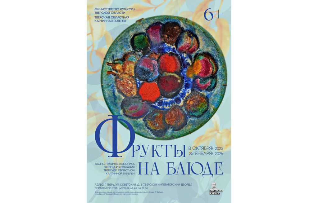 Тверская областная картинная галерея приглашает жителей и гостей столицы Верхневолжья на выставку фаянса, графики и живописи XX века «Фрукты на блюде» (6+). Это керамика, украшенная мастерами Отари Гагнидзе, Николаем Коковихиным, Николаем Гавриловым, Генрихом Вебером, Мариам Асламазян, работы художников Марии Клещар-Самохваловой, Азария Коджака, Василия Власова и других. Впервые представлен набор для мёда «Туесок» Глеба Садикова.