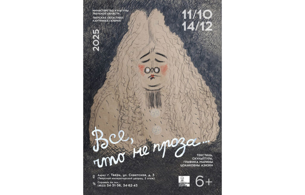 Кроме того, 11 октября в Тверской картинной галерее начнёт работу персональная выставка Марины Азизян – выдающегося театрального художника, сценографа, графика и мастера текстильного искусства «Всё, что не проза…» (6+).