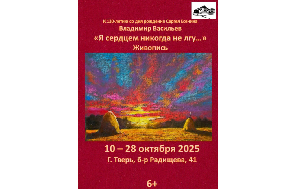 В Музее живописи Валентина Сидорова «На тёплой земле» работает выставка работ тверского художника Владимира Васильева «Я сердцем никогда не лгу…» (6+). Экспозиция посвящена 130-летию со дня рождения Сергея Есенина – одного из любимых поэтов Валентина Сидорова – и навеяна образами его стихотворений. Всего зрителям будет представлено порядка 30 картин мастера.