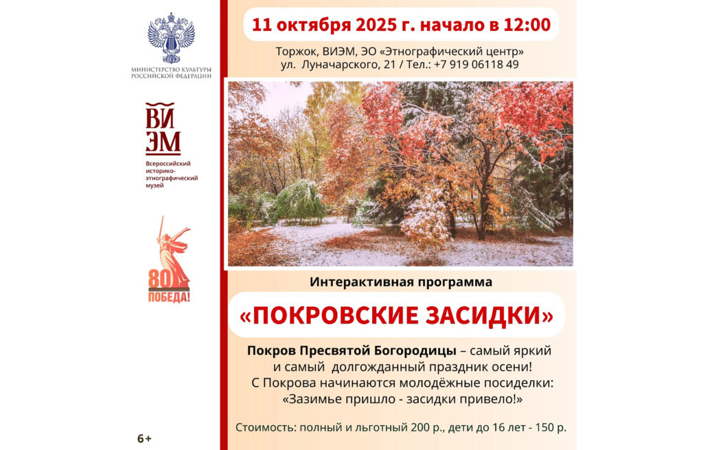 В Торжке в Этнографическом центре Всероссийского историко-этнографического музея состоится интерактивная программа «Покровские засидки» (6+). Гостям расскажут, как в старину праздновали великий Покров Пресвятой Богородицы, какие русские обычаи и традиции были связаны с этим праздником. В программе – русские песни и пляски, народные игры под гармонь.