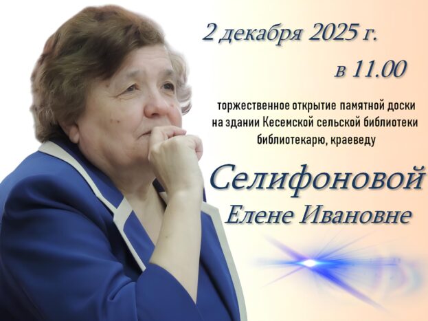 Весьегонская центральная библиотека приглашает на торжественное открытие памятной доски на здании Кесемской сельской библиотеки библиотекарю, краеведу Елене Ивановне Селифоновой, которое состоится 2 декабря 2025 года в 11.00.